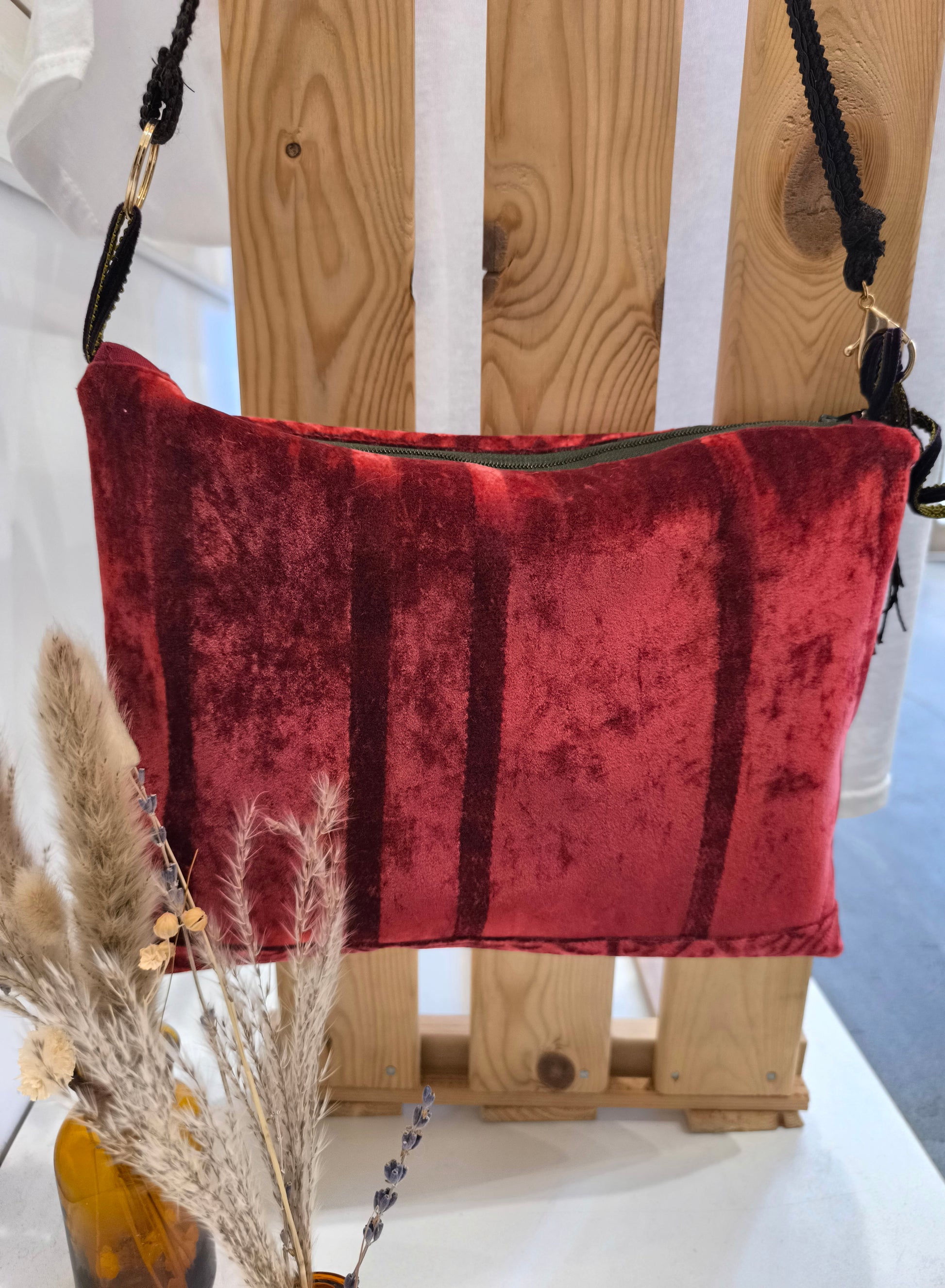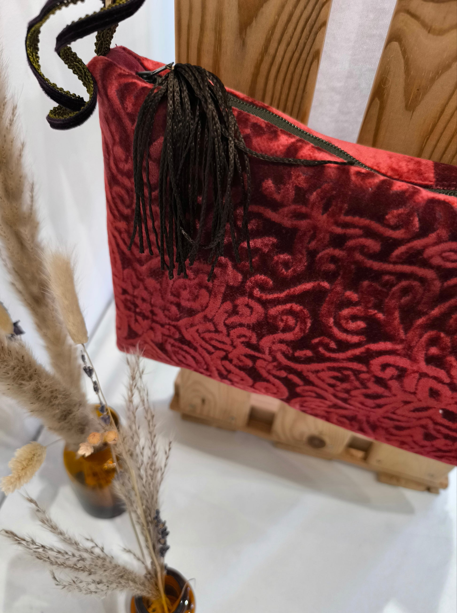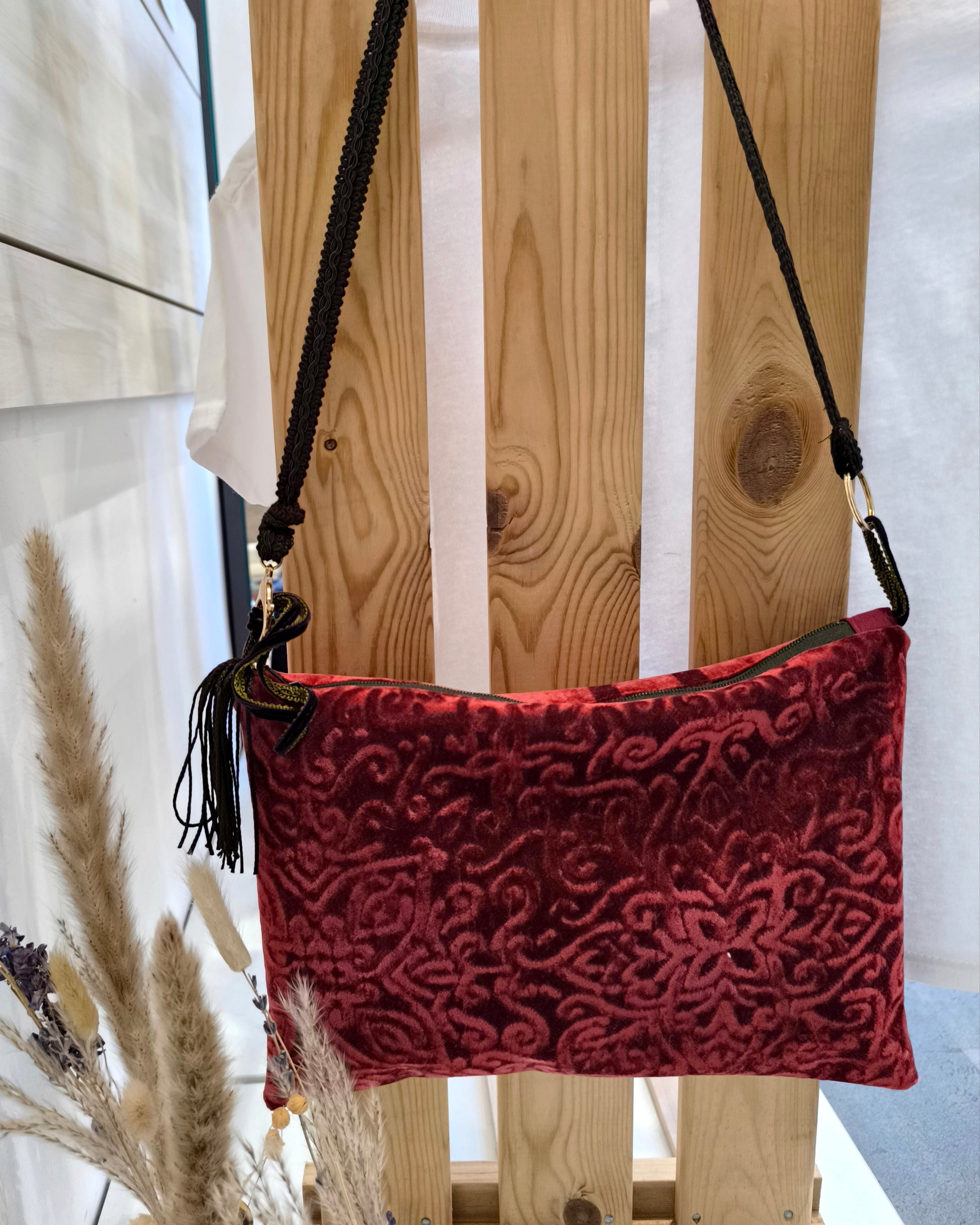La borsetta a tracolla che porta un tocco di opulenza teatrale al tuo guardaroba. Realizzata in un velluto a rilievo di un profondo e avvolgente color rosso rubino.