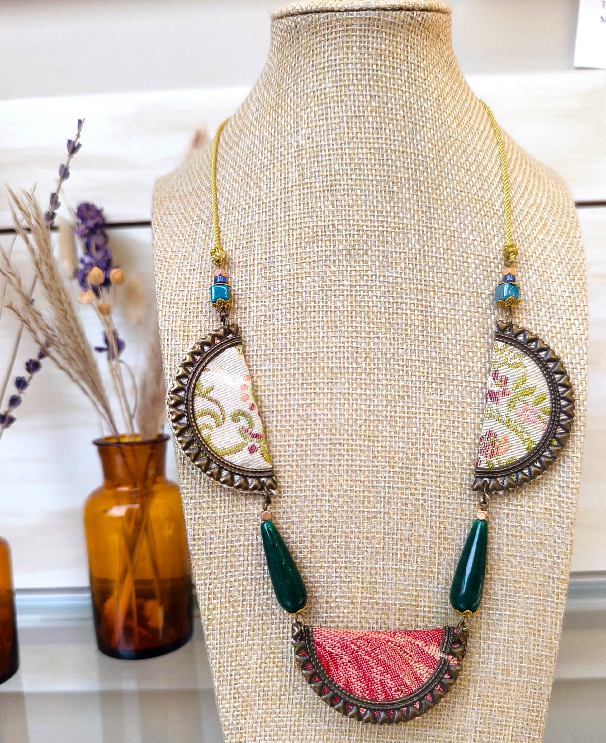 Collana realizzata con semicerchi in tessuto vintage e impreziosita da due pietre di giada verde con taglio a goccia.