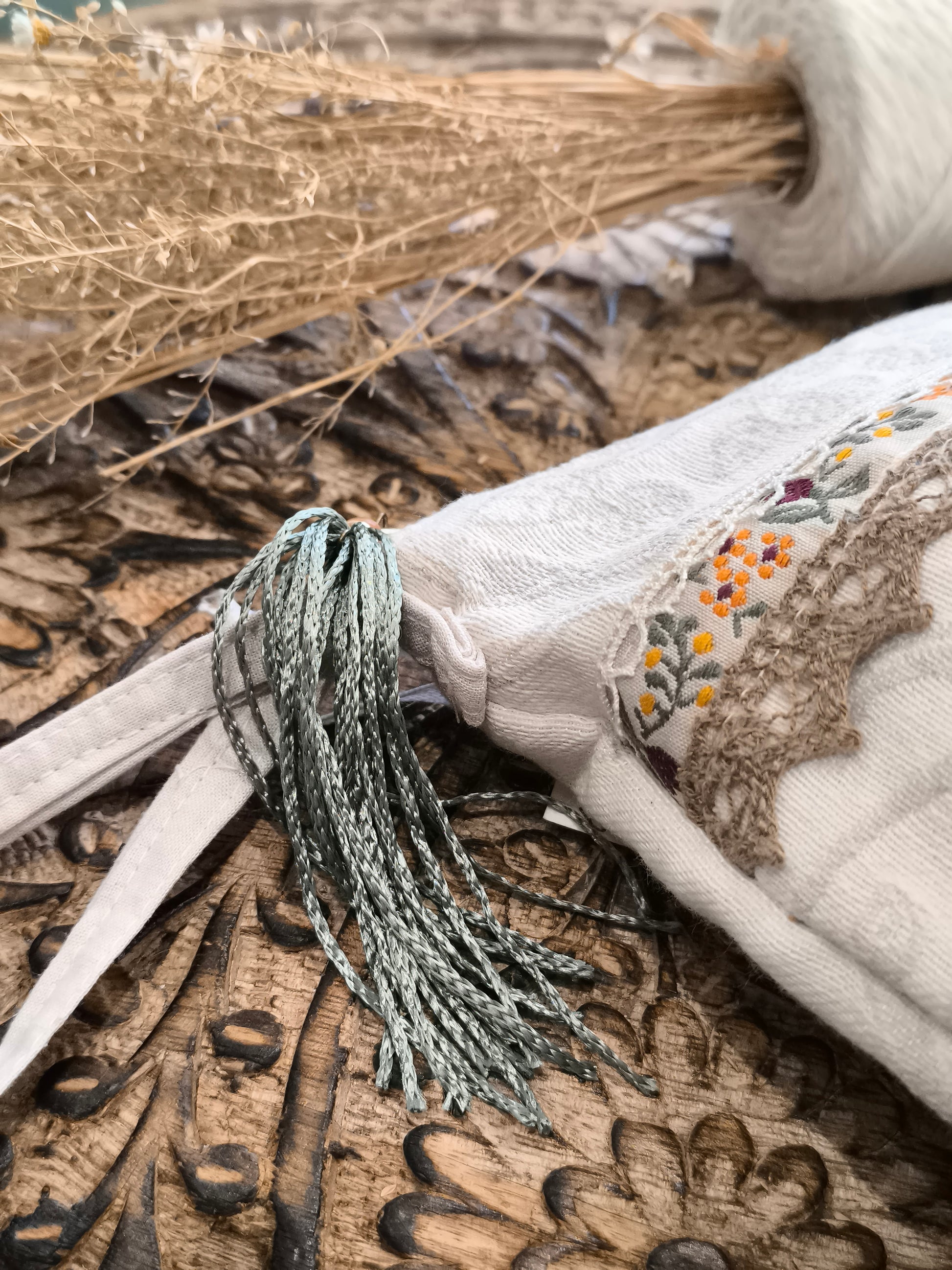 La pochette Sara è realizzata in stoffa di tappezzeria, con una raffinata cerniera e una delicata nappa decorativa.