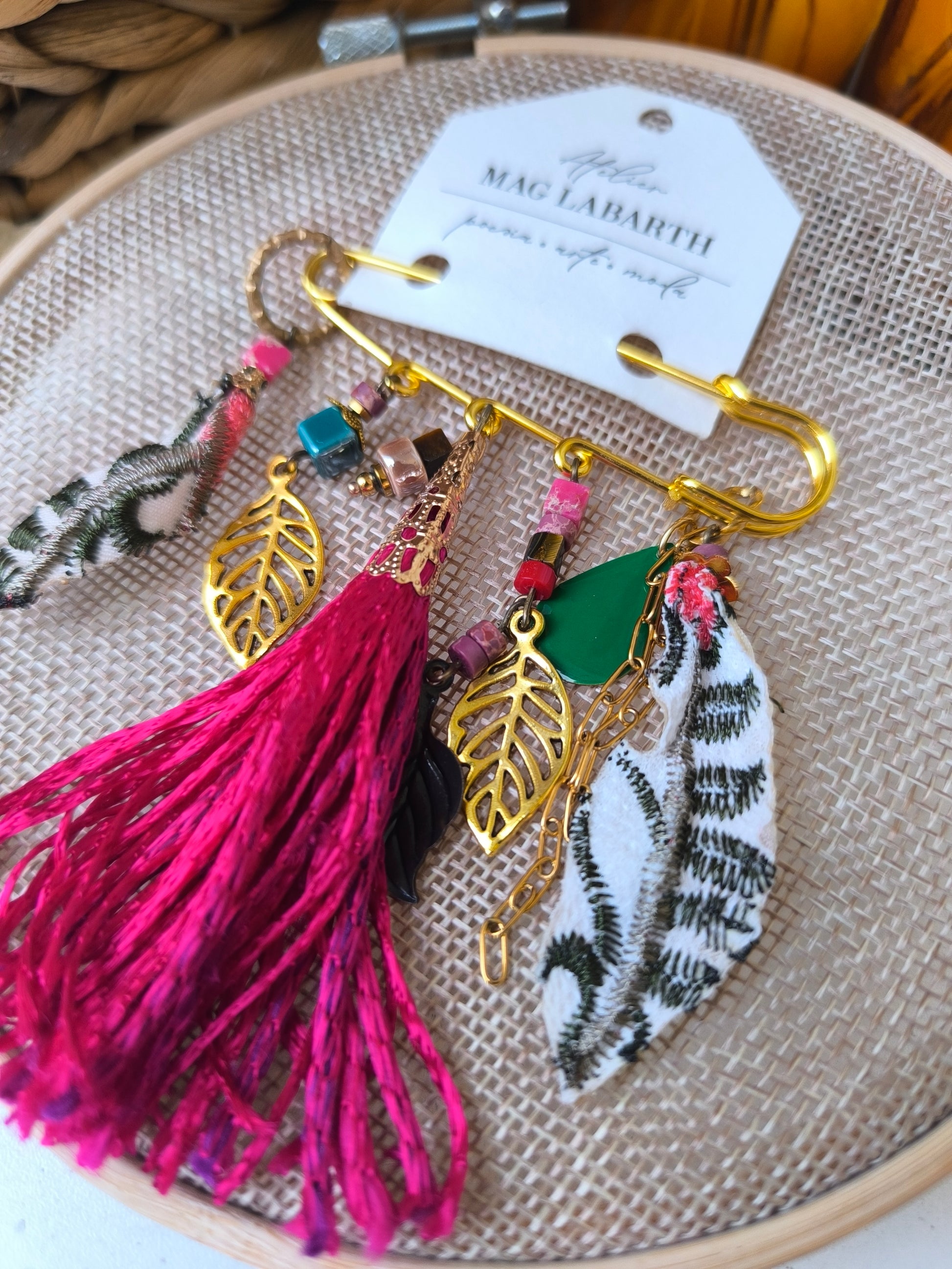 Realizzata su una base a spilla da balia dorata, è impreziosita con pezzi tessili, pietre dure e ciondoli a forma di piuma