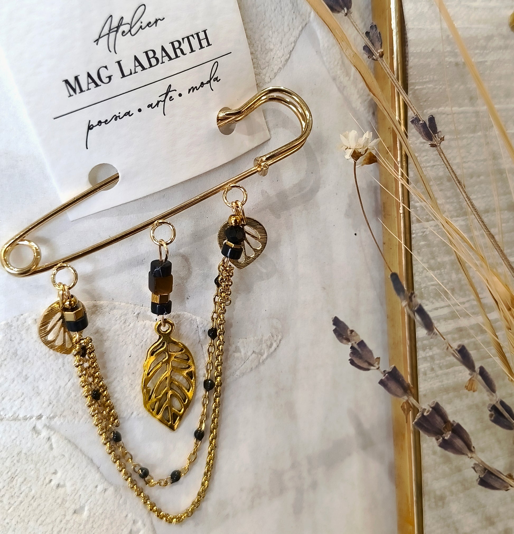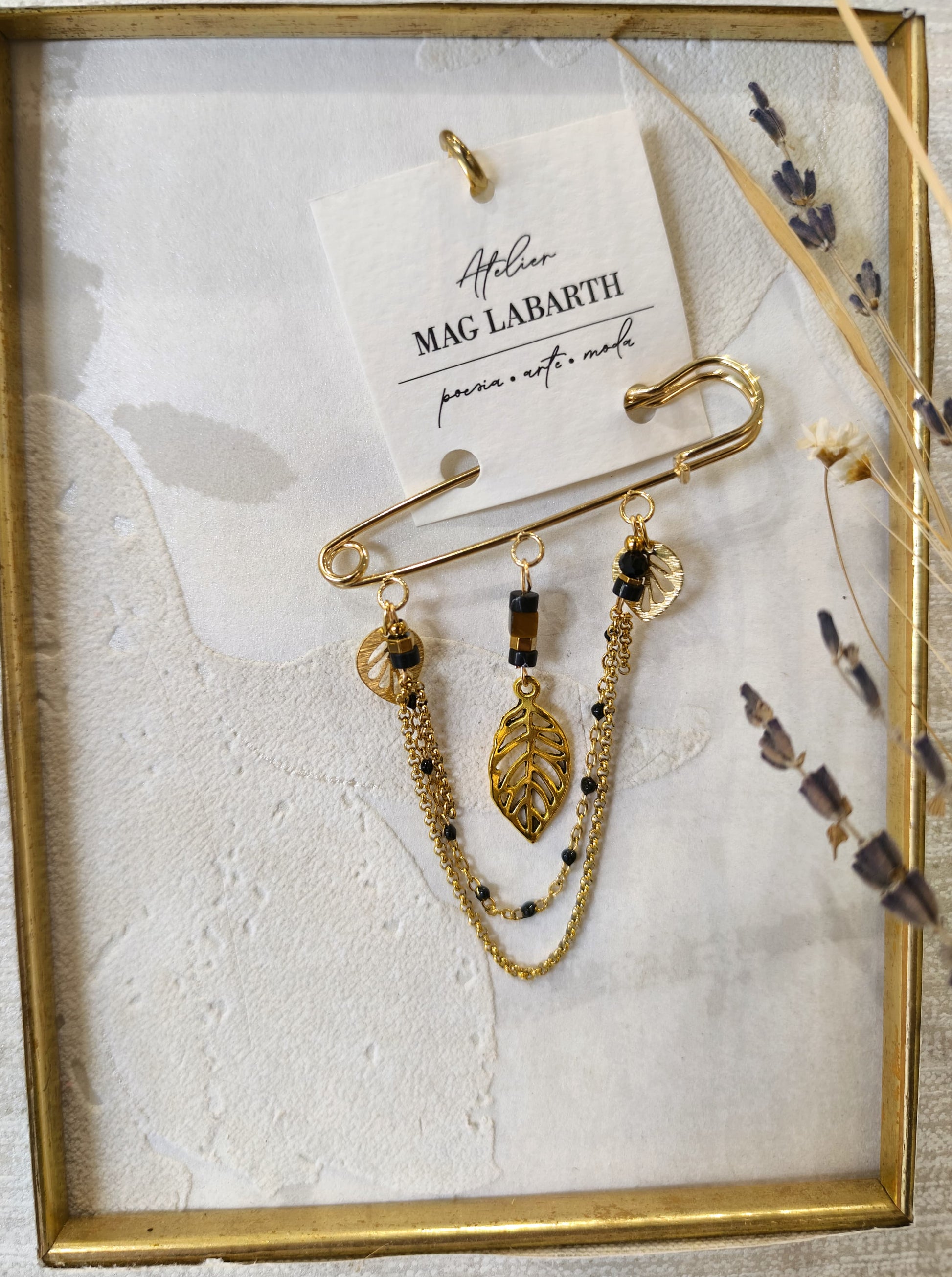 Realizzata su una base a spilla da balia dorata, è impreziosita con pietre dure, catene e ciondoli a forma di piuma
