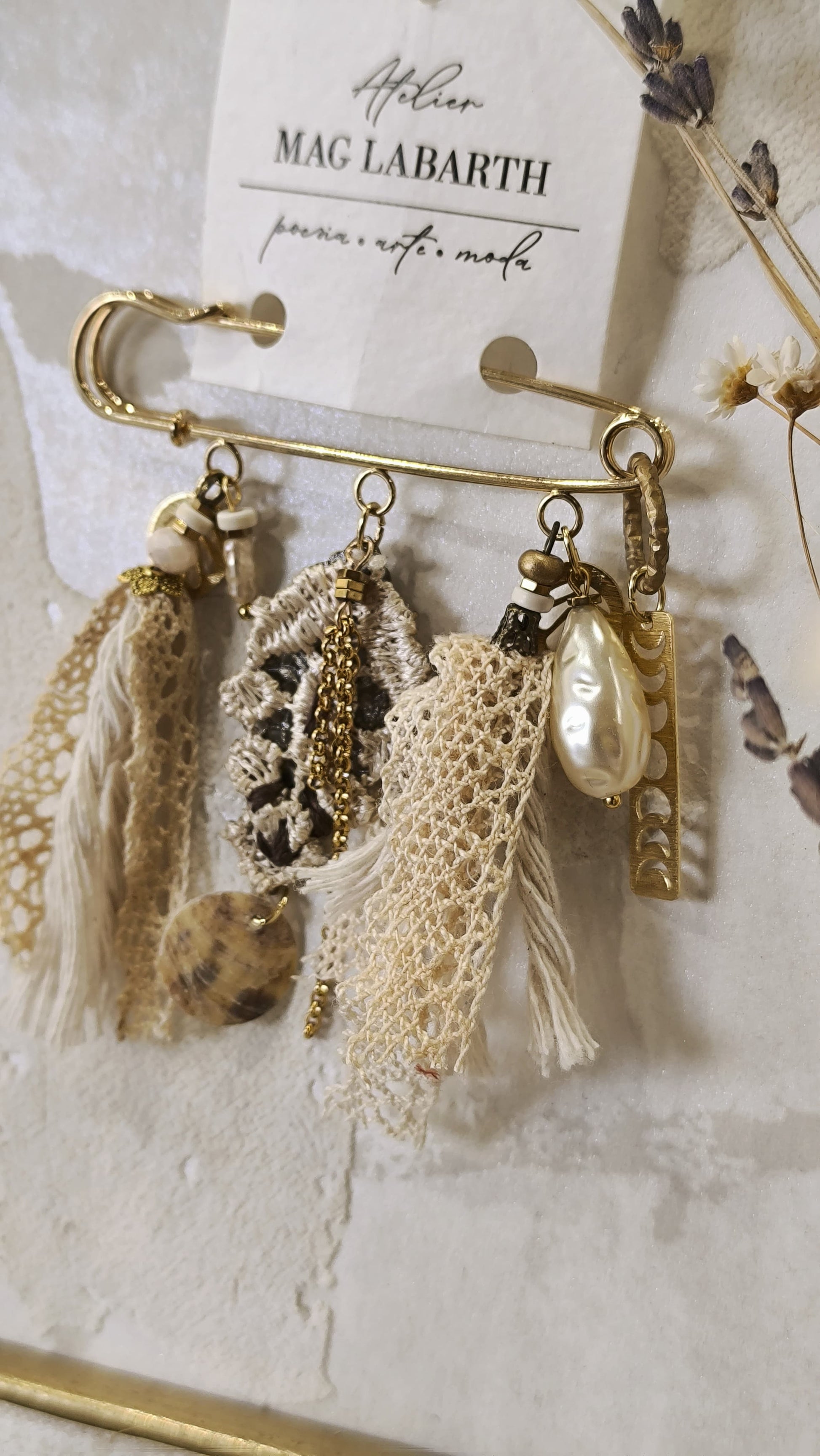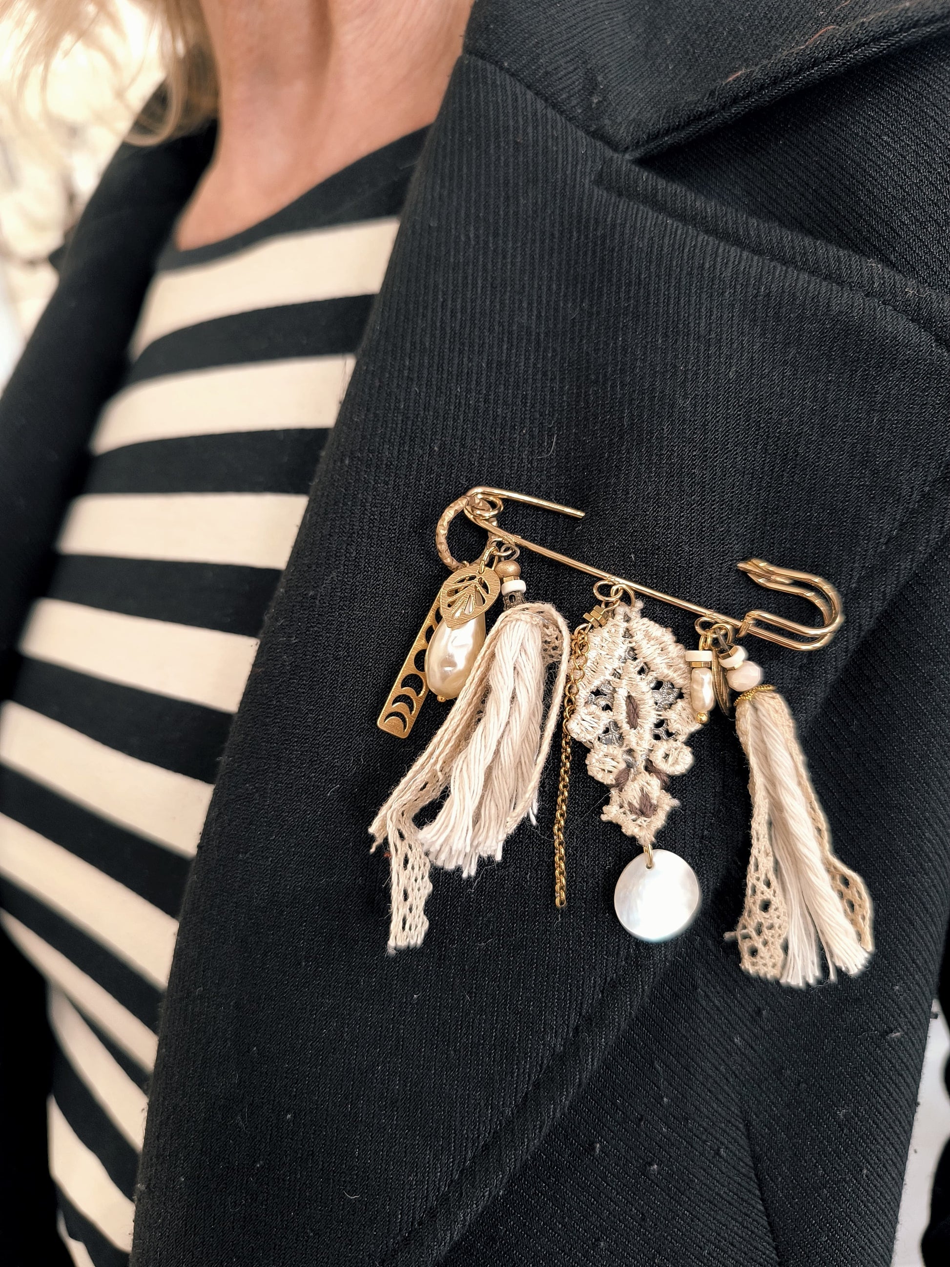 Realizzata su una base a spilla da balia dorata, è impreziosita da pizzo artigianale vintage , perle iridescenti e nappe in tessuto.